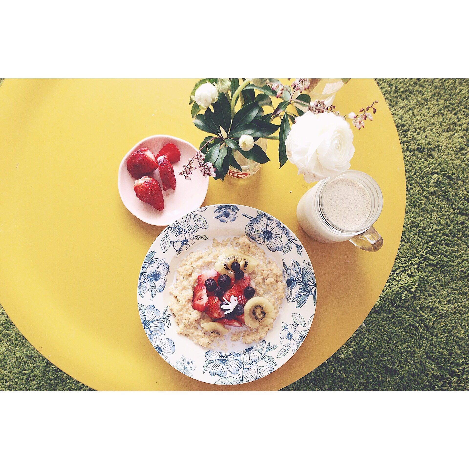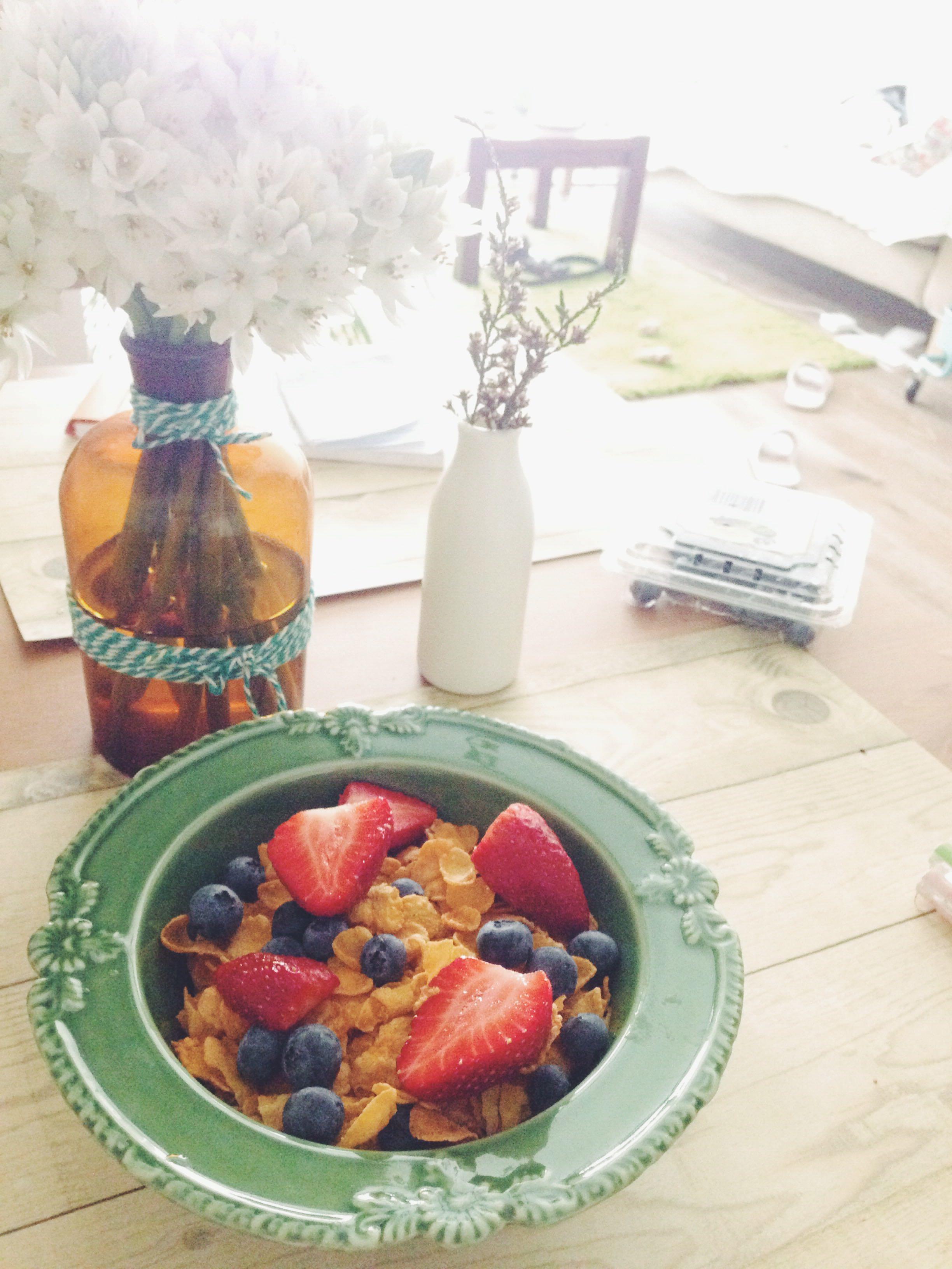 早餐,简单的麦片加水果和蜂蜜、牛奶: