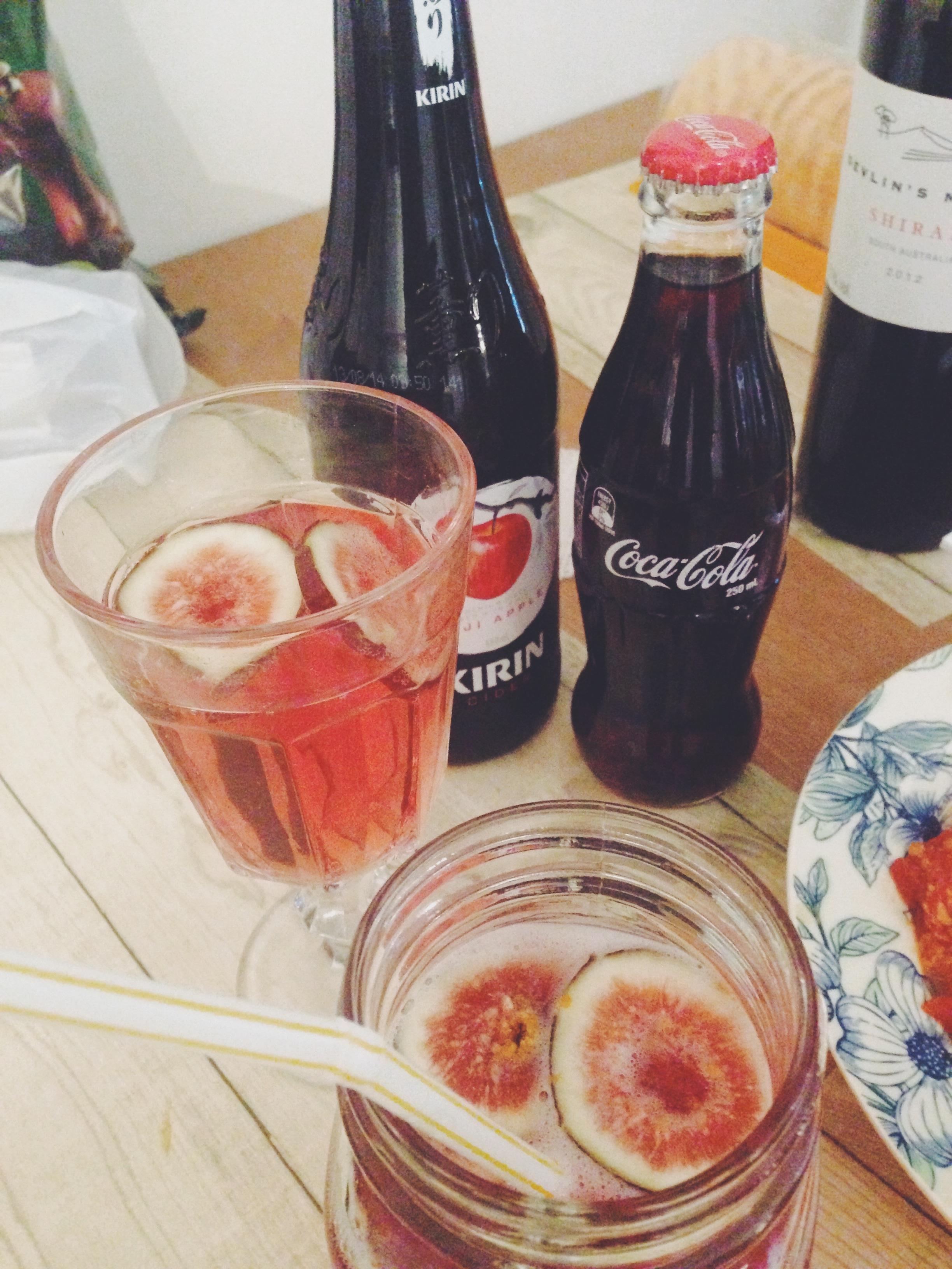 自己弄的无花果加果子酒,好看又好喝,配上朋友们来时才拿出来的杯子用(平时不用是因为真的不好洗):